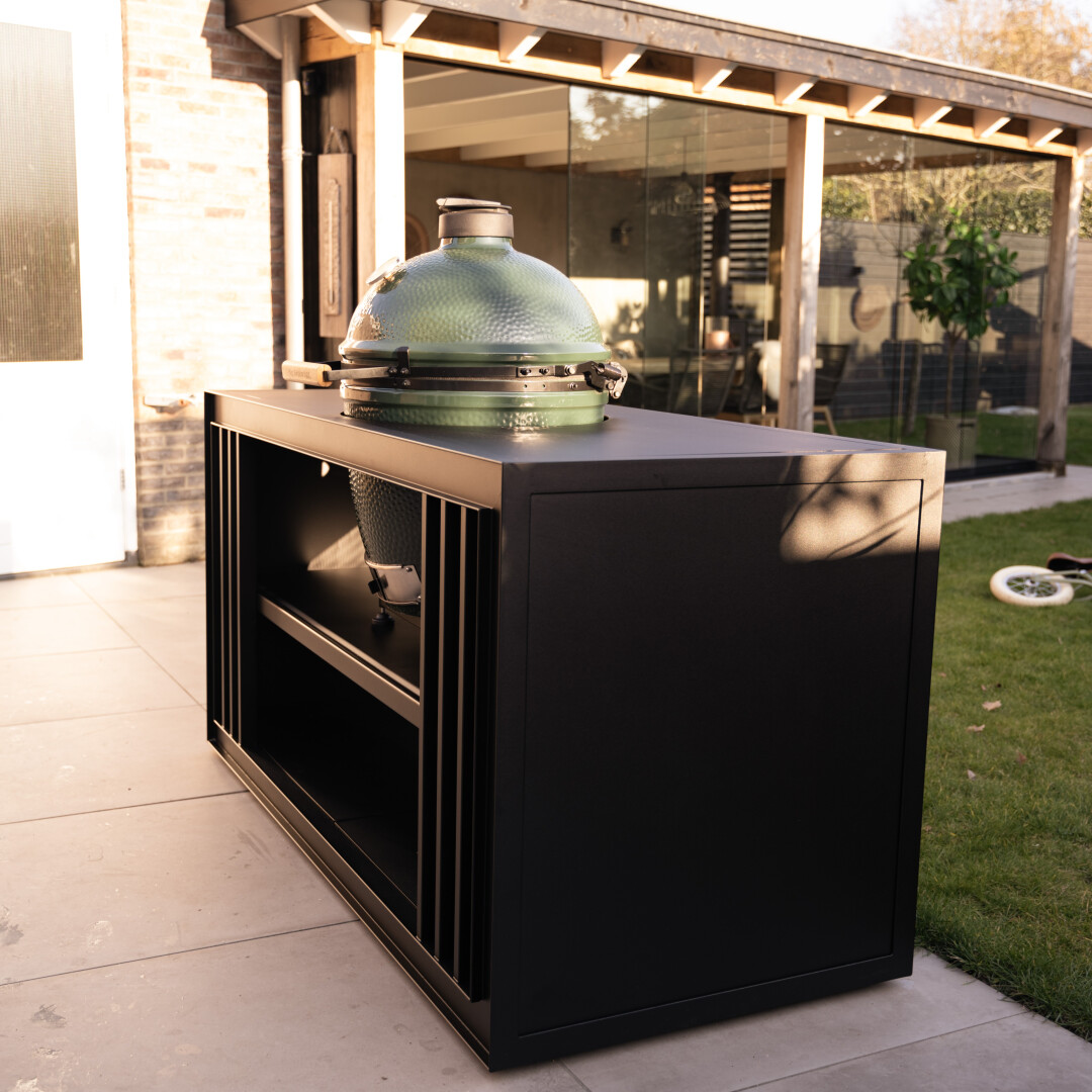 This particularly compact model, known as SALT, features a functional and stylish design. With a width of 180cm and a depth of 80cm, there is plenty of working space available and plenty of room to store materials. In this version, we chose the colour Black Berry from BORLEY's special Taste collection. The striking black colour makes the model a real showpiece in the garden. In addition, the small mobile wheels under this outdoor kitchen, are not only very practical but seem to make the design float.