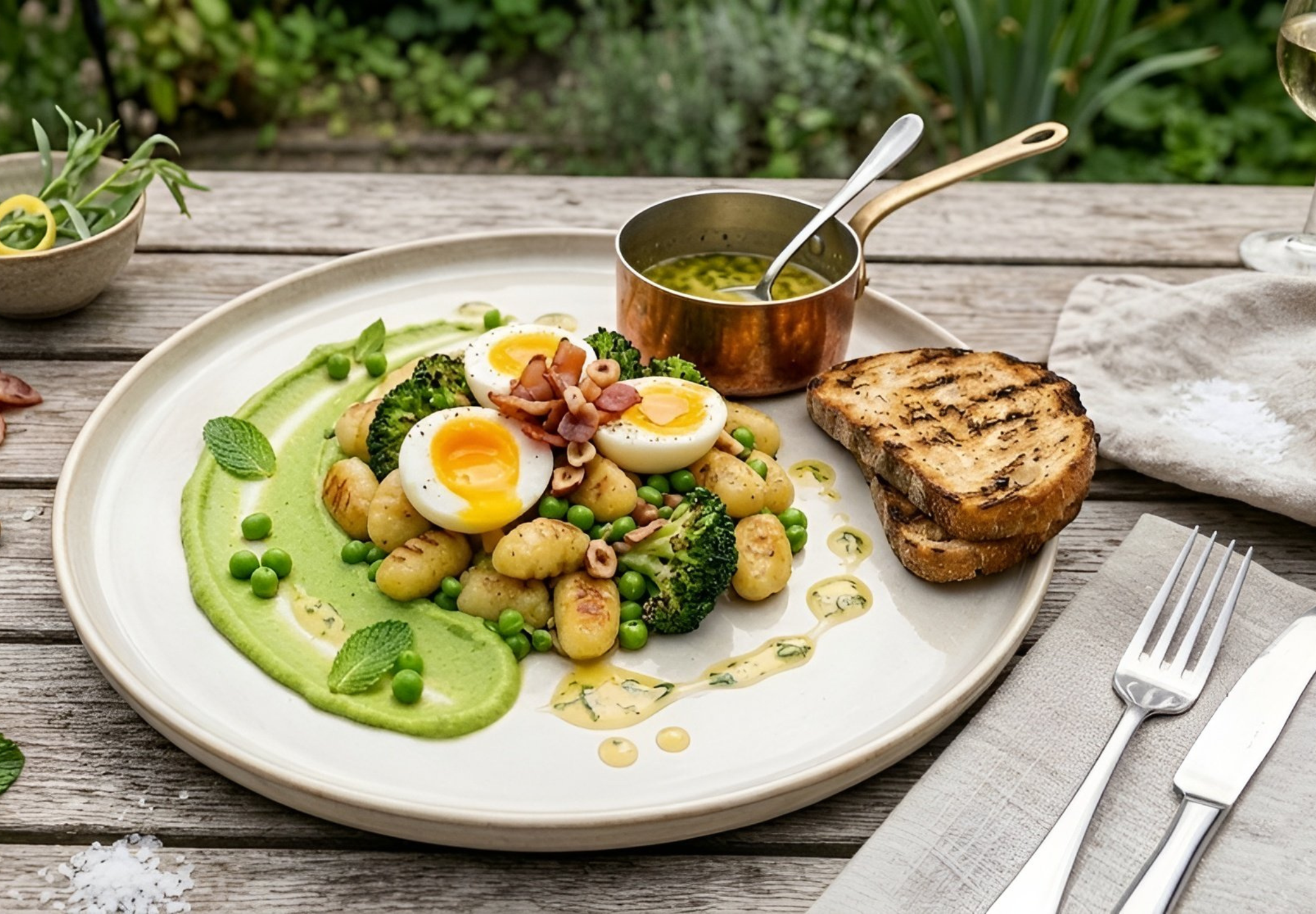 3. Pancetta met broccoli en doperwten, dragon-citroenboter, gekookt ei en gnocchi